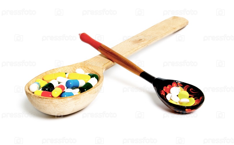Деревянные ложки с таблетками на белом фоне