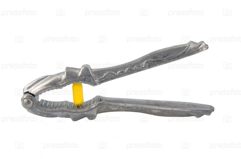 Желтая медицинская таблетка и щипцы для орехов на белом фоне