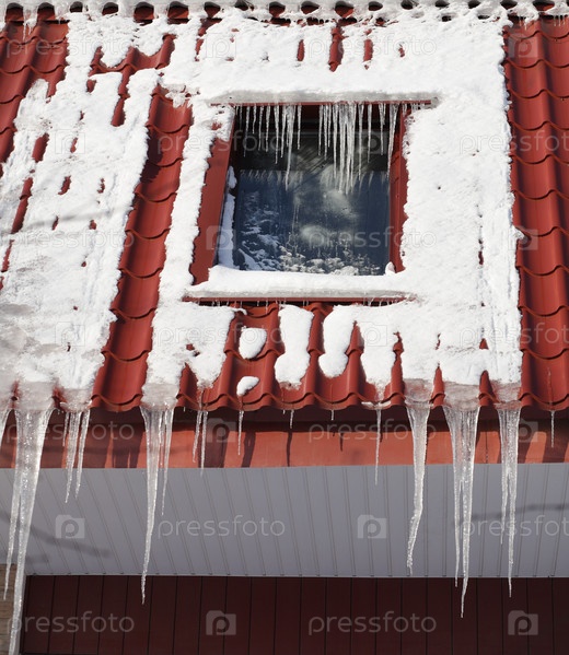 Ледники на крыше здания в солнечный зимний день