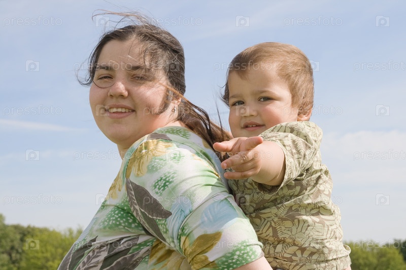 Женщина с ребенком на плечах