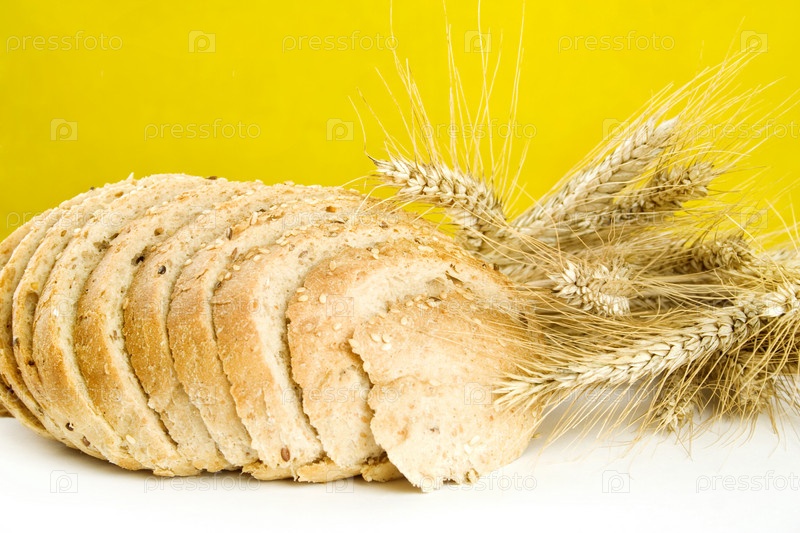 Свежий хлеб, нарезанный ломтиками, и колосья пшеницы на желтом фоне