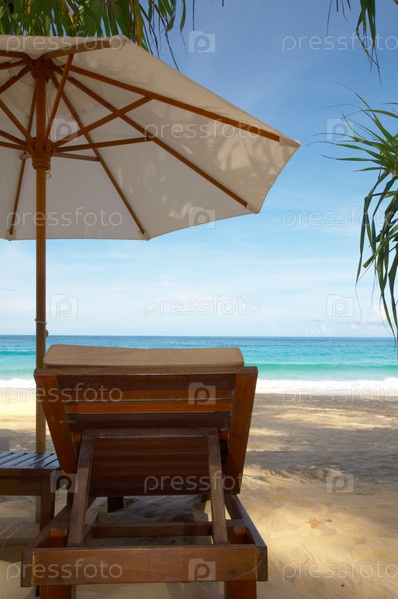 Шезлонг и зонтик на пляже
