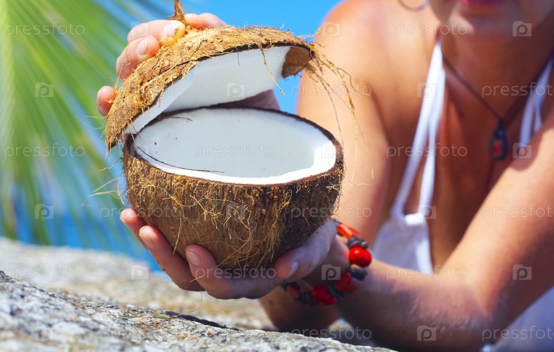Женщина с кокосом на пляже