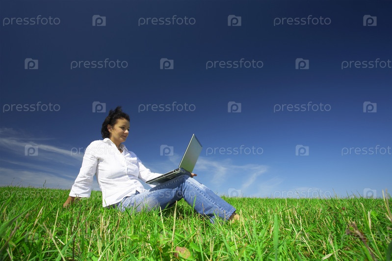 Женщина с ноутбуком на поляне