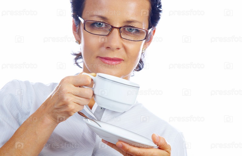 Портрет женщины с чашкой кофе на белом фоне