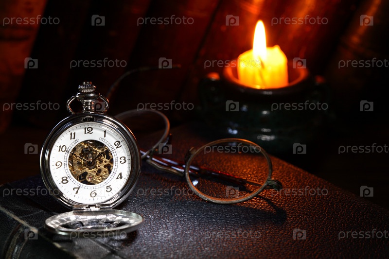 Старинные карманные часы и очки возле свечи на темном фоне
