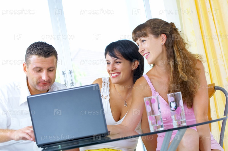 Две женщины и мужчина перед ноутбуком