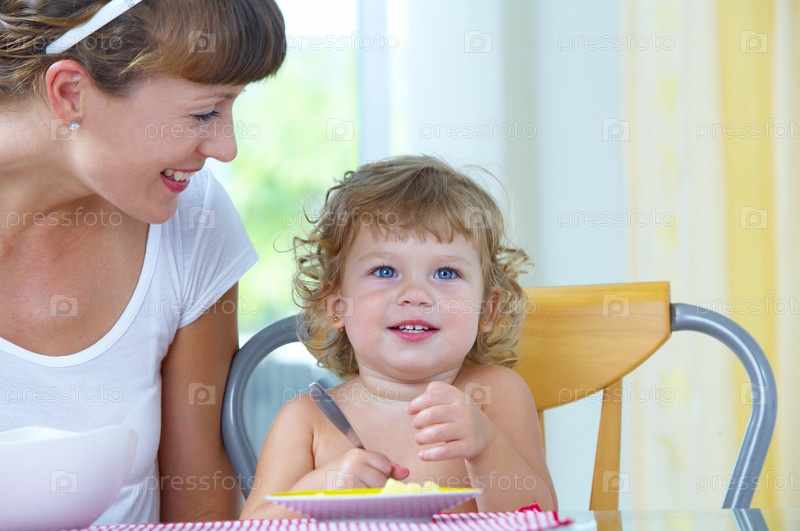 Женщина кормит дочь