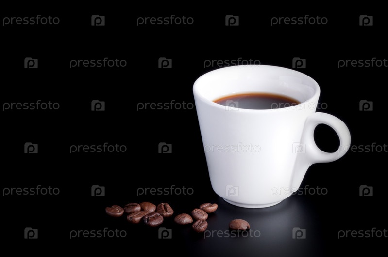 Белая чашка и кофейные бобы изолированы на черном фоне
