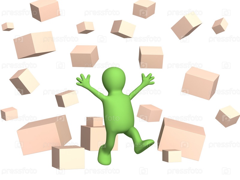 Счастливый человечек среди абстрактных падающих ящиков