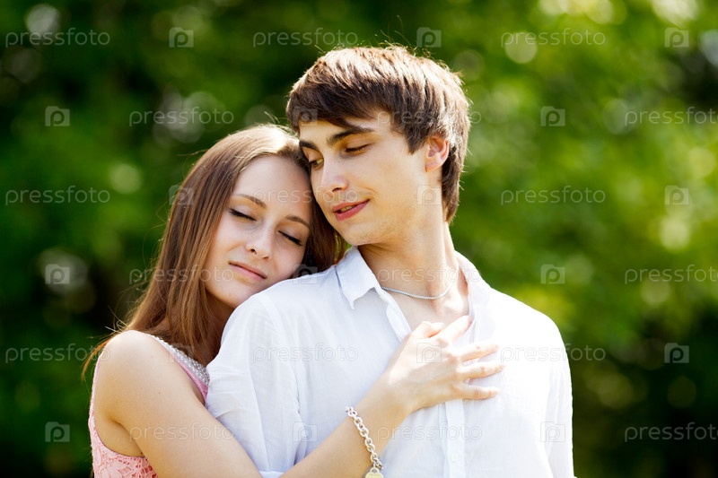 Молодая влюбленная пара на улице летом