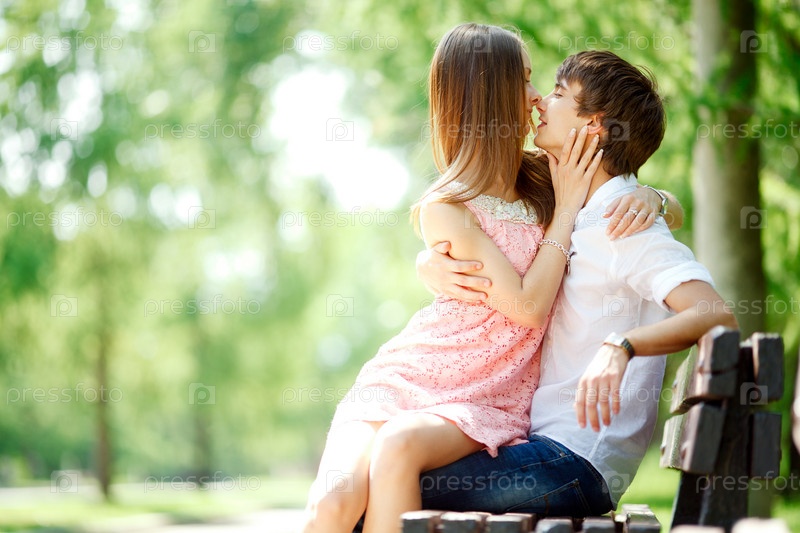 Молодая влюбленная пара целуется на скамейке в парке