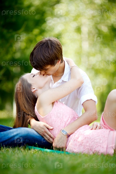 Молодая влюбленная пара целуется на газоне в летнем парке