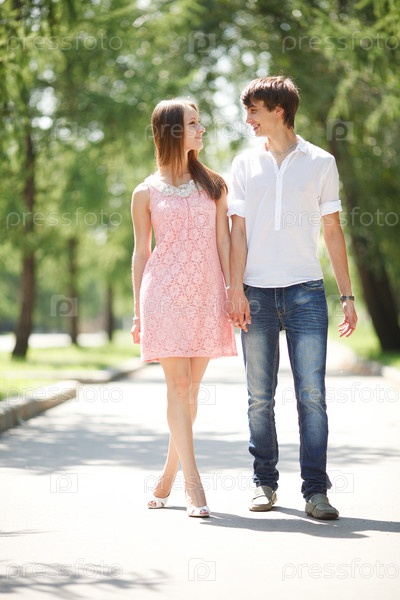 Молодая влюбленная пара гуляет в летнем парке