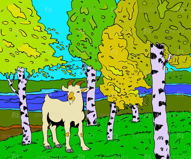 Осенний солнечный пейзаж с рекой и козой