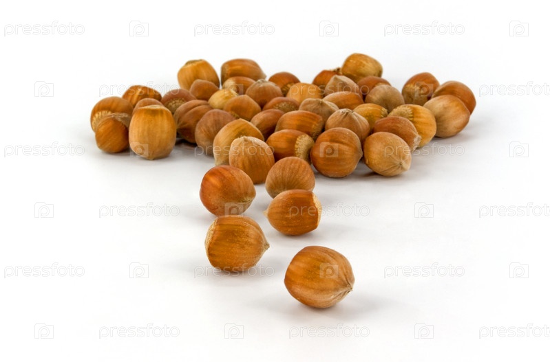 Рассыпанный фундук на белом фоне