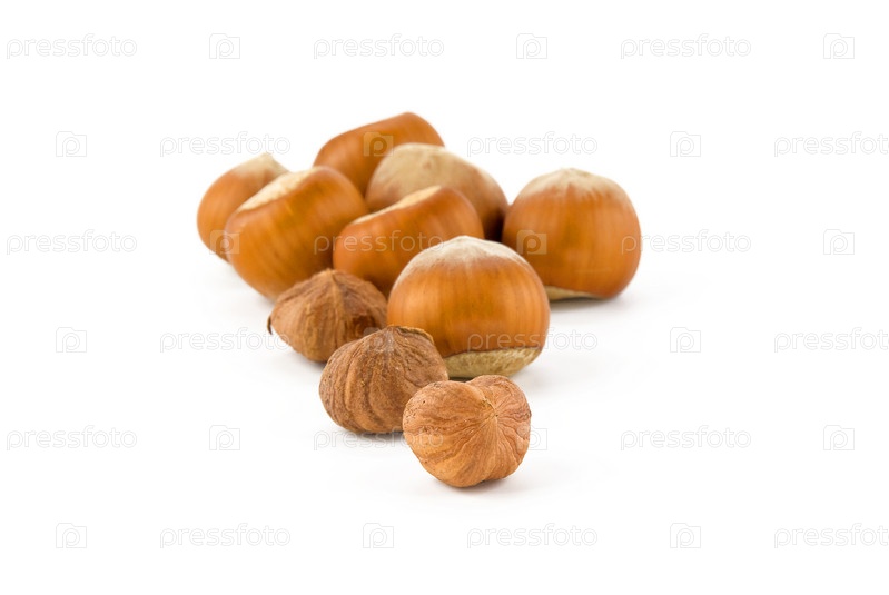 Целый и очищенный фундук на белом фоне