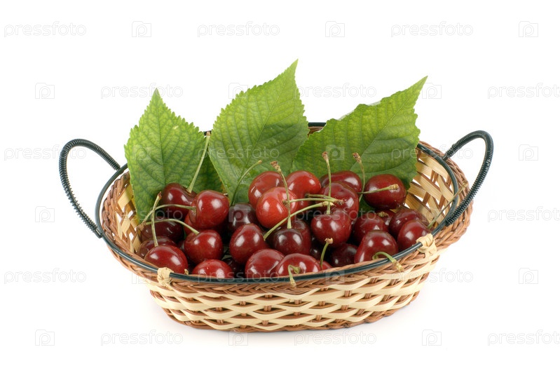 Вишня в корзине на белом фоне
