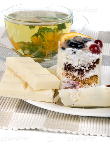 Травяной чай, шоколад и пирожное на клетчатой скатерти