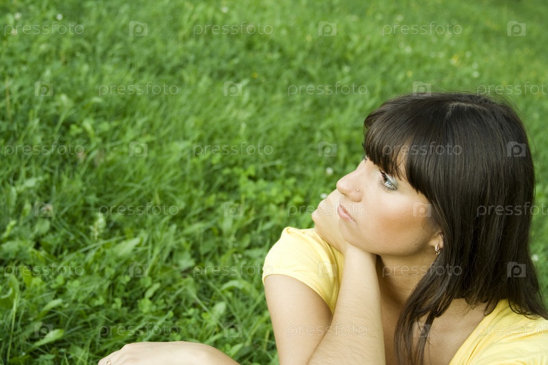 Задумчивая девушка сидит на лужайке в парке