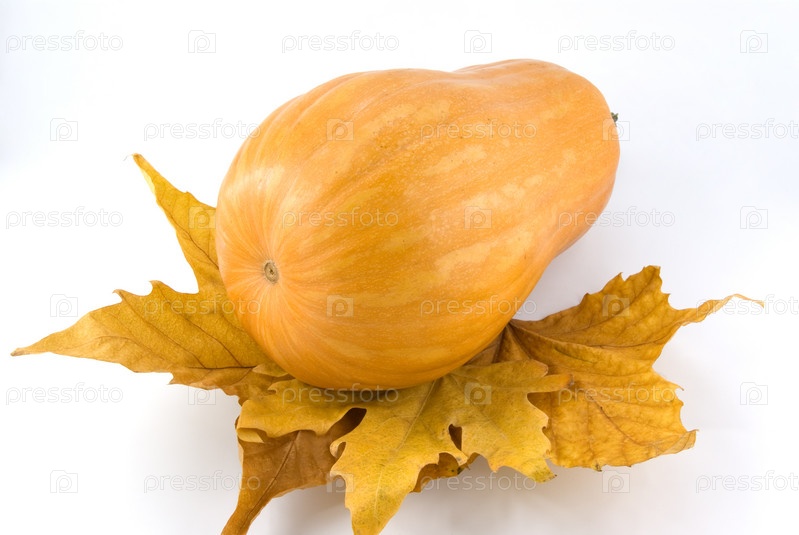 Тыква на осенних кленовых листьях, белый фон