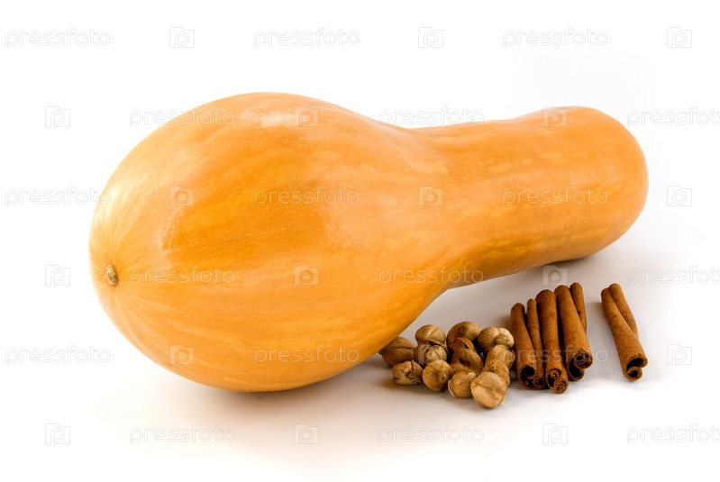 Тыква, кардамон и палочки корицы на белом фоне
