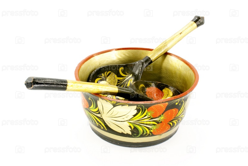 Деревянная миска и ложки в русском стиле на белом фоне