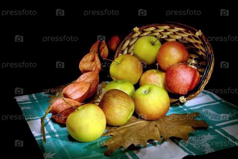 Яблоки в корзине на темном фоне