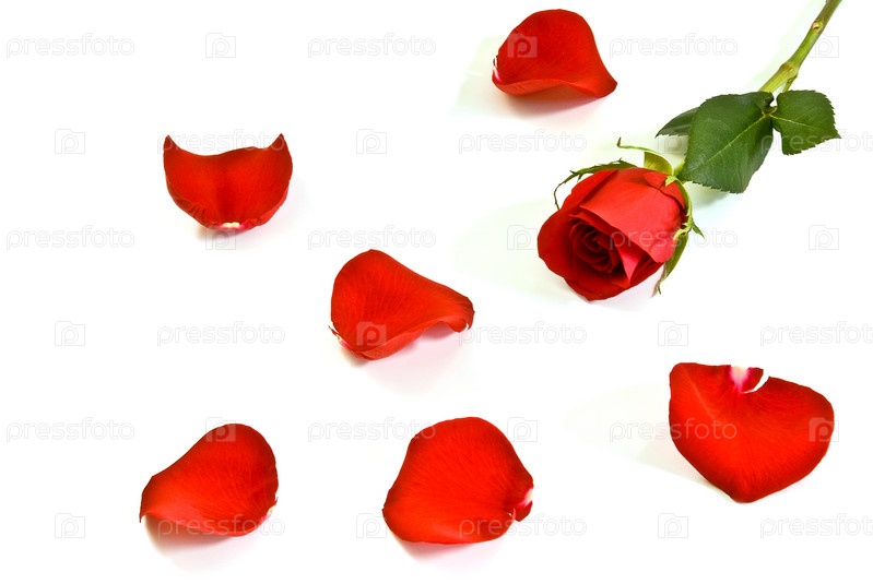Красная роза и рассыпанные цветочные лепестки на белом фоне