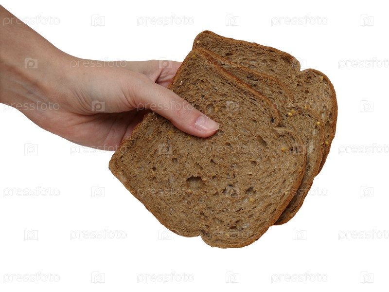 Три ломтика черного хлеба в руке на белом фоне