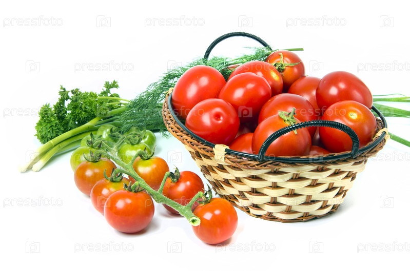 Спелые помидоры в плетеной миске и зелень, белый фон