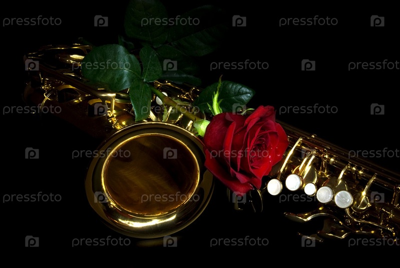 Альт-саксофон и красная роза на черном фоне