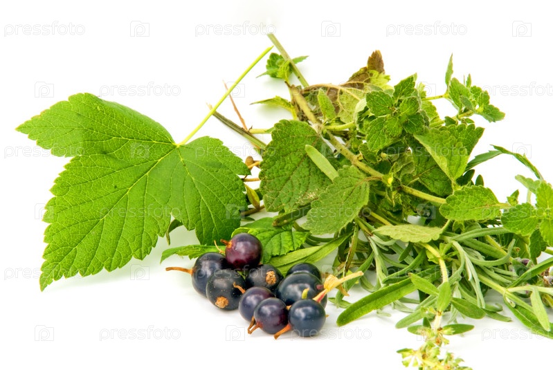 Ягоды черной смородины с листьями на белом фоне