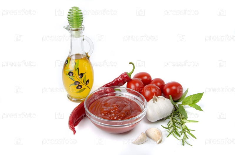 Подсолнечное масло, кетчуп и свежие овощи со специями на белом фоне