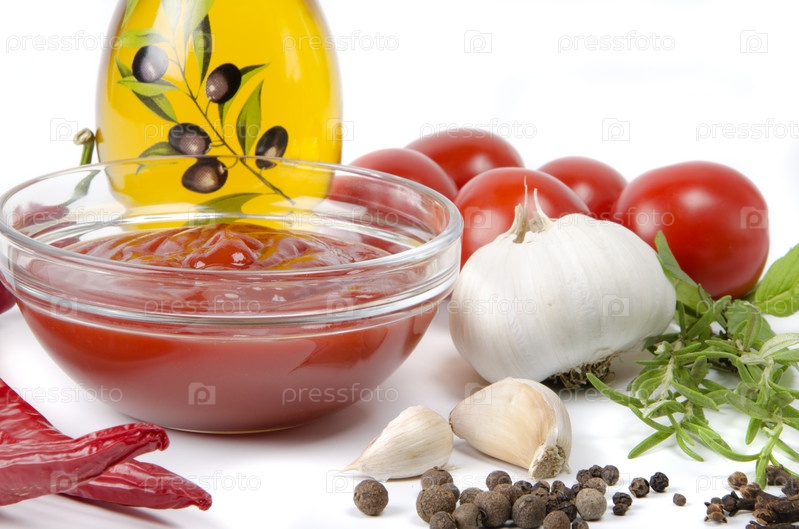 Подсолнечное масло, кетчуп и свежие овощи со специями на белом фоне