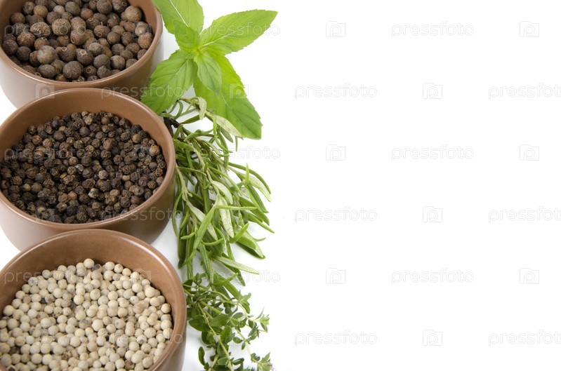 Специи в мисках и душистые травы на белом фоне