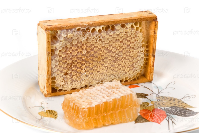 Соты на тарелке на белом фоне