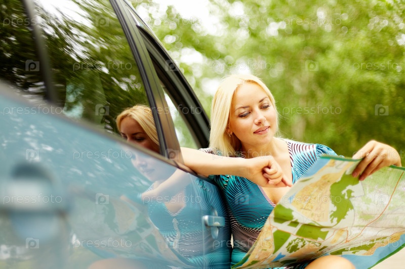 Симпатичная блондинка с картой в руках сидит возле автомобиля