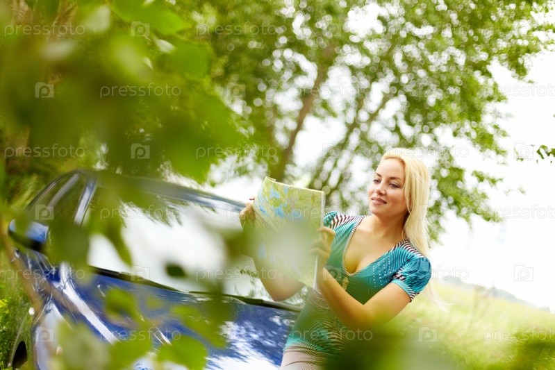 Блондинка рассматривает карту, сидя на капоте автомобиля