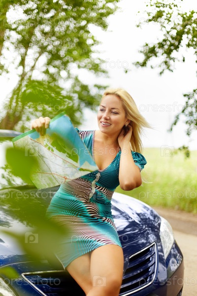 Блондинка рассматривает карту, сидя на капоте автомобиля