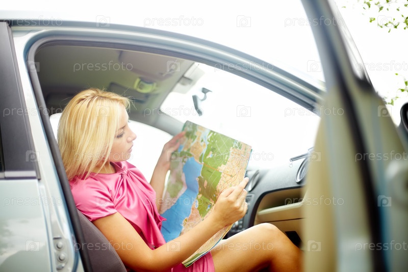 Блондинка рассматривает карту, сидя в автомобиле