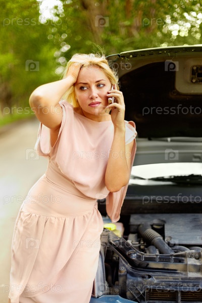 Расстроенная женщина разговаривает по телефону возле сломанного автомобиля