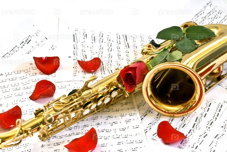 Саксофон и роза, лежащие на музыкальных нотах на белом фоне