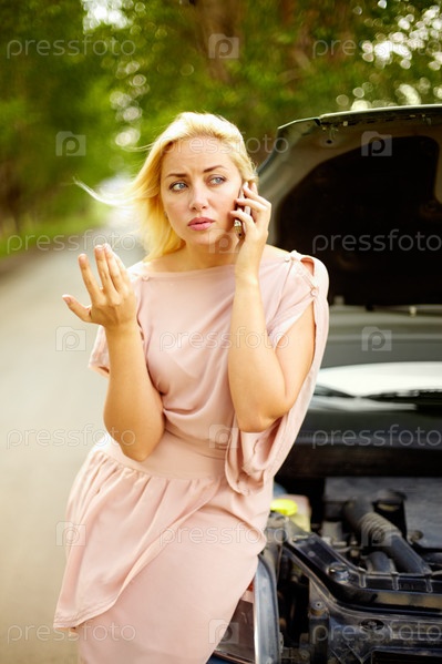 Расстроенная женщина разговаривает по телефону возле сломанного автомобиля