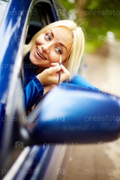 Блондинка делает макияж, глядя в боковое зеркало автомобиля