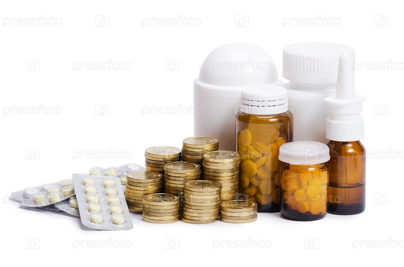 Таблетки и деньги на белом фоне