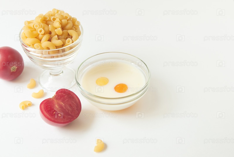Два яйца с молоком в стеклянной миске, макароны и помидоры