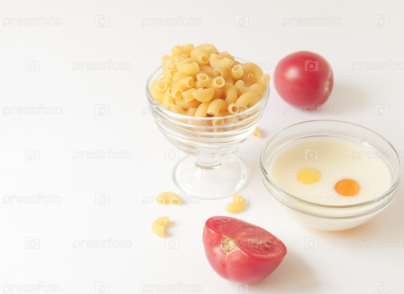 Два яйца с молоком в стеклянной миске, макароны и помидоры