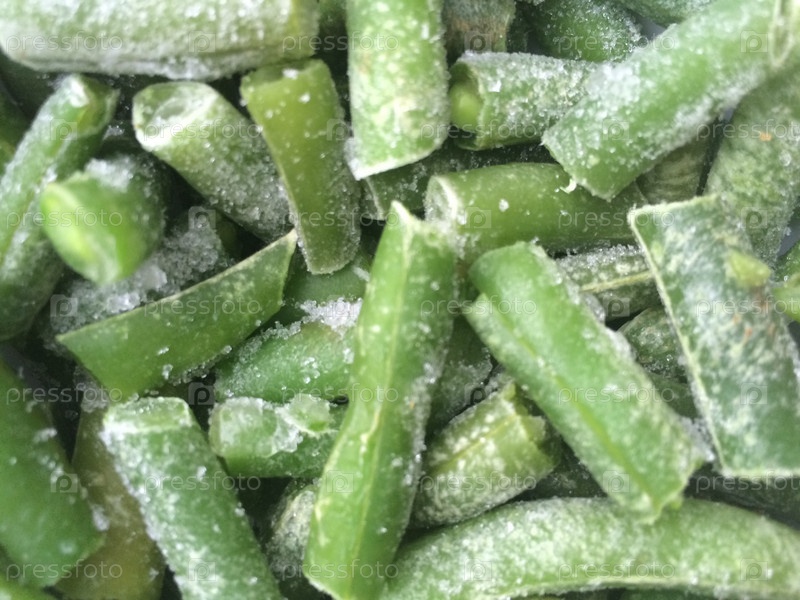 Зеленая фасоль в замороженном состоянии с кусочками льда и снега