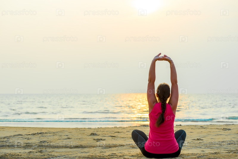 Женщина занимается йогой на пляже